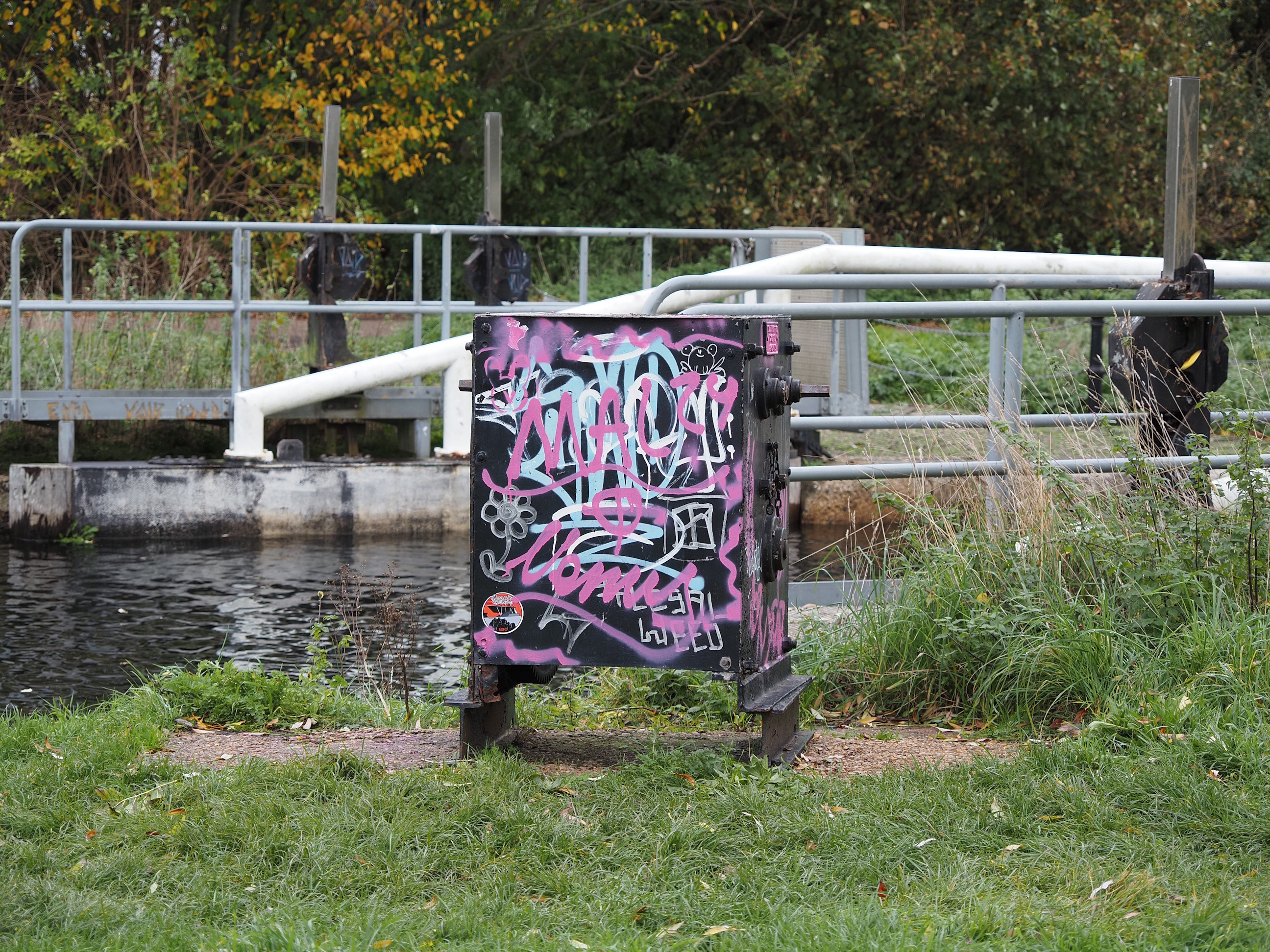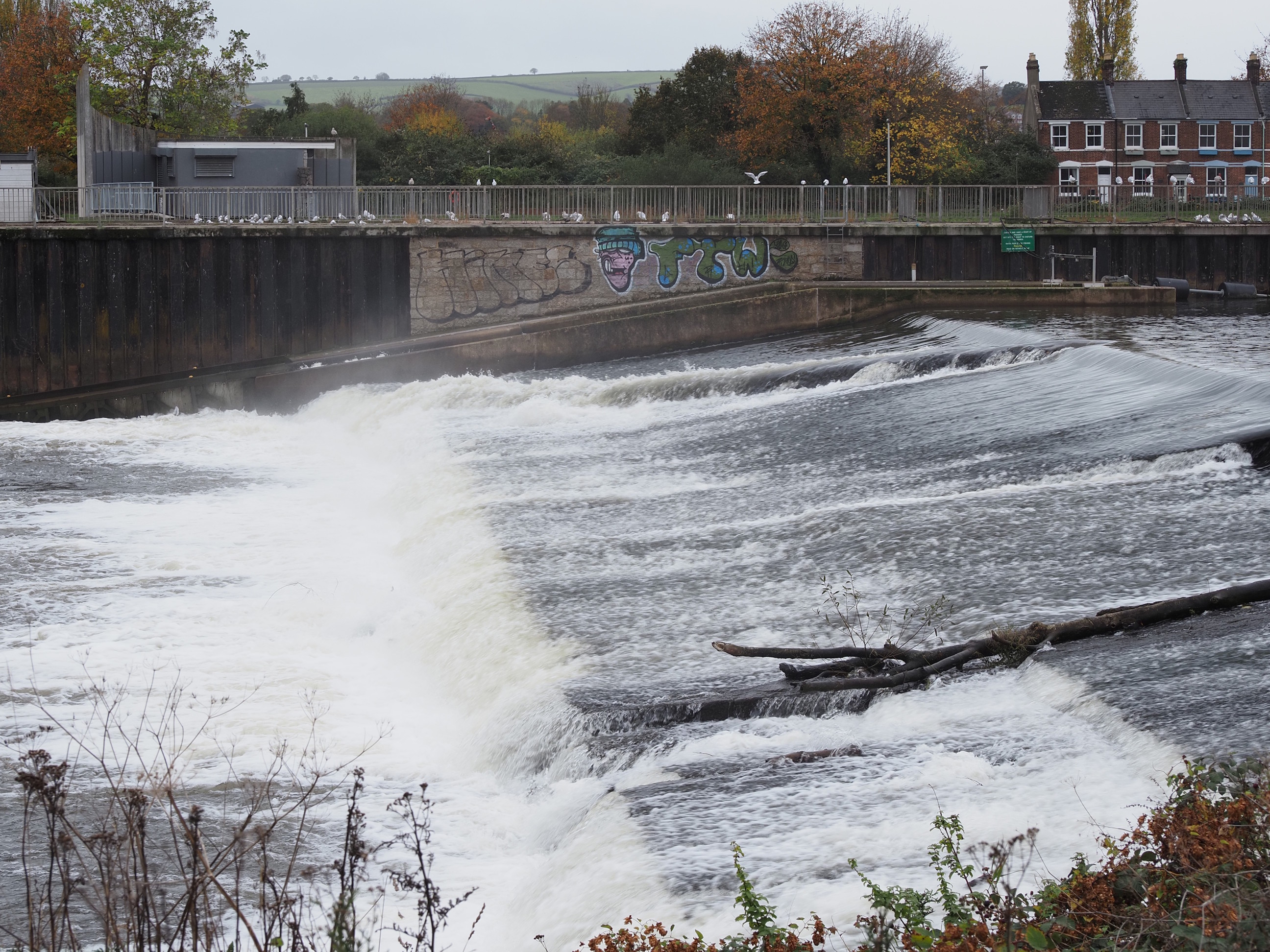 Plenty of water going over the wear with some nice graffiti to cheer the place up . . .