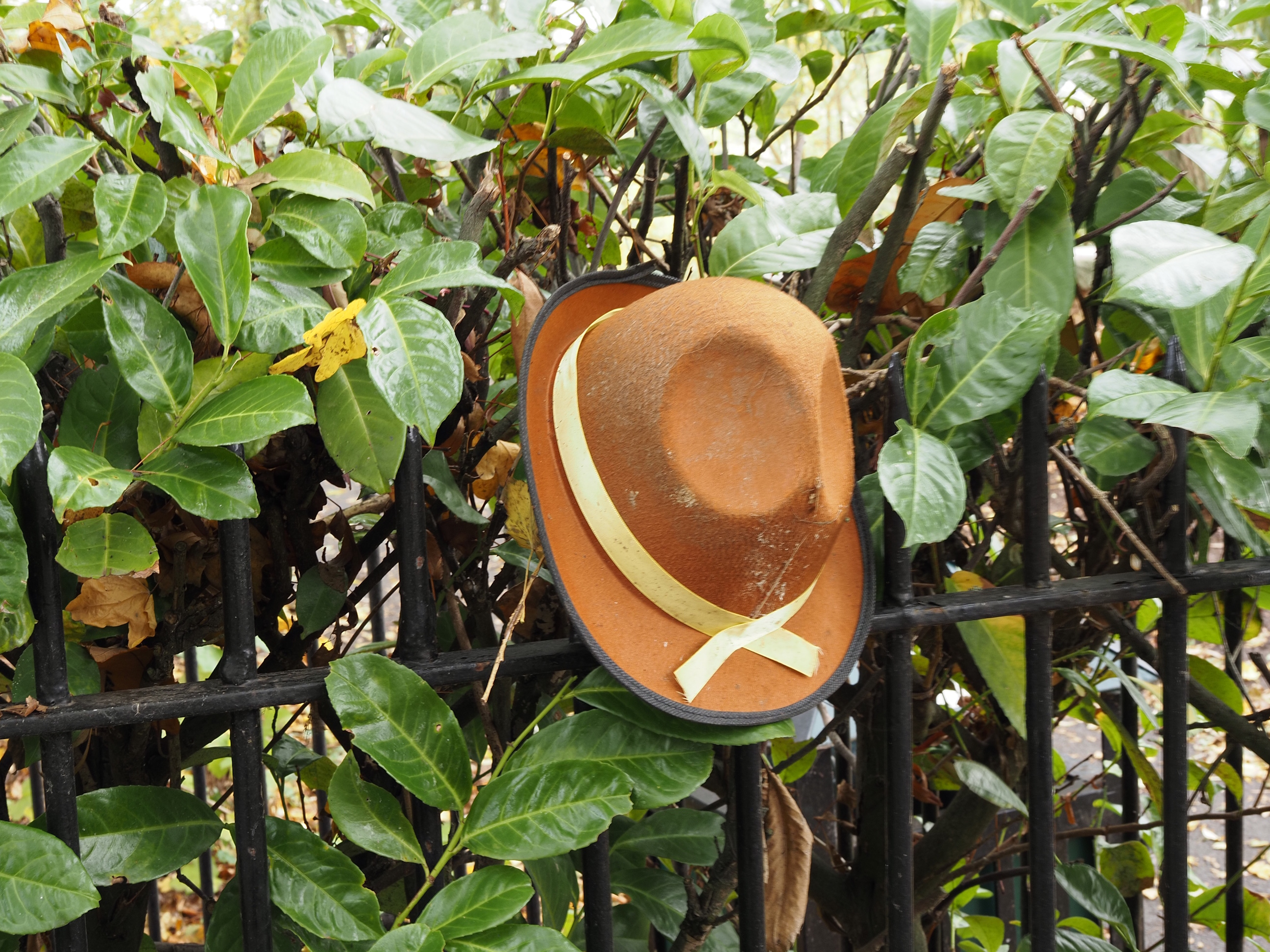 The second random hat of the day. This was outside the gardens, on the path we were walking along. Not sure what it’s about: but two random hats in one walk . . .