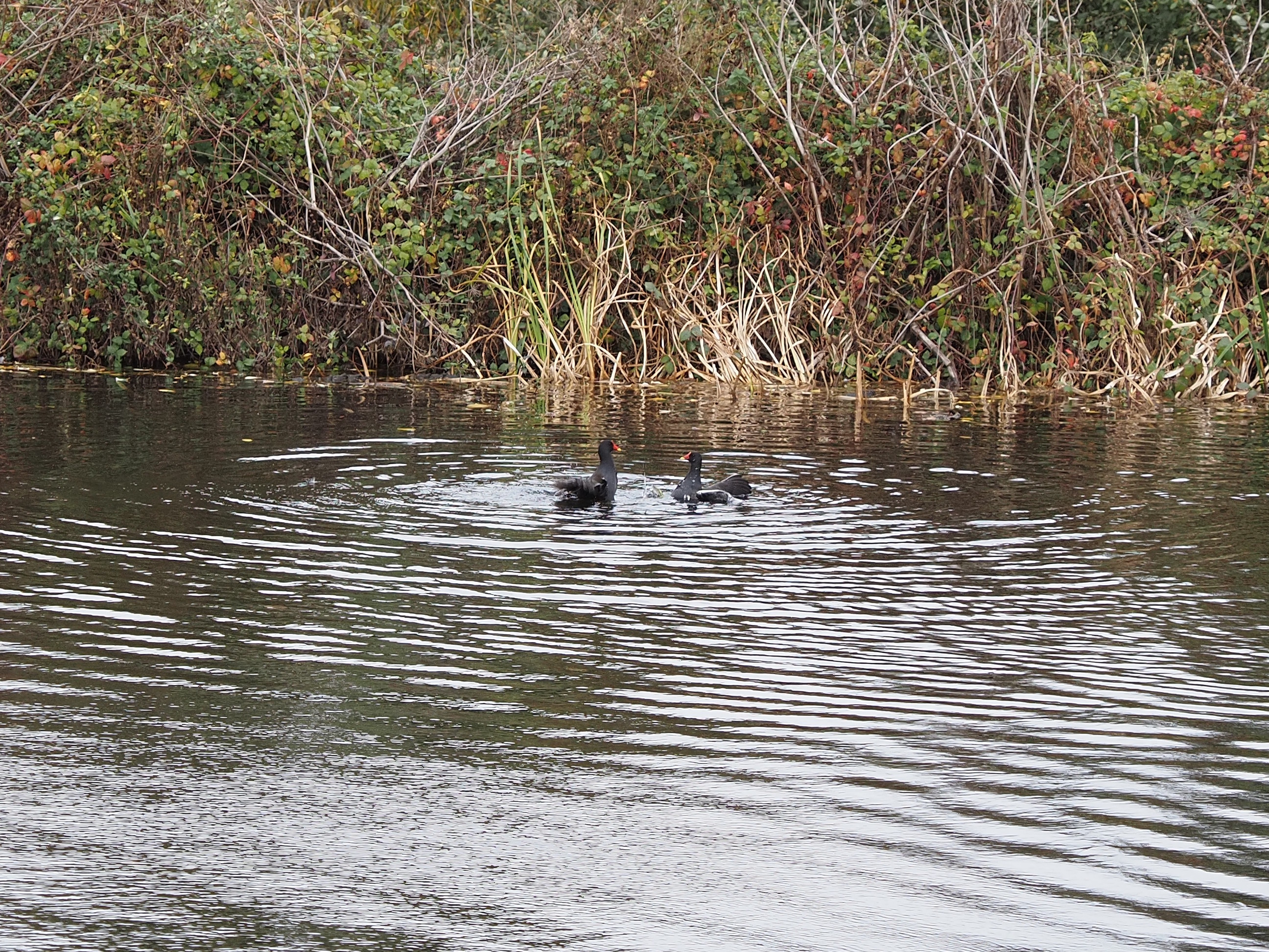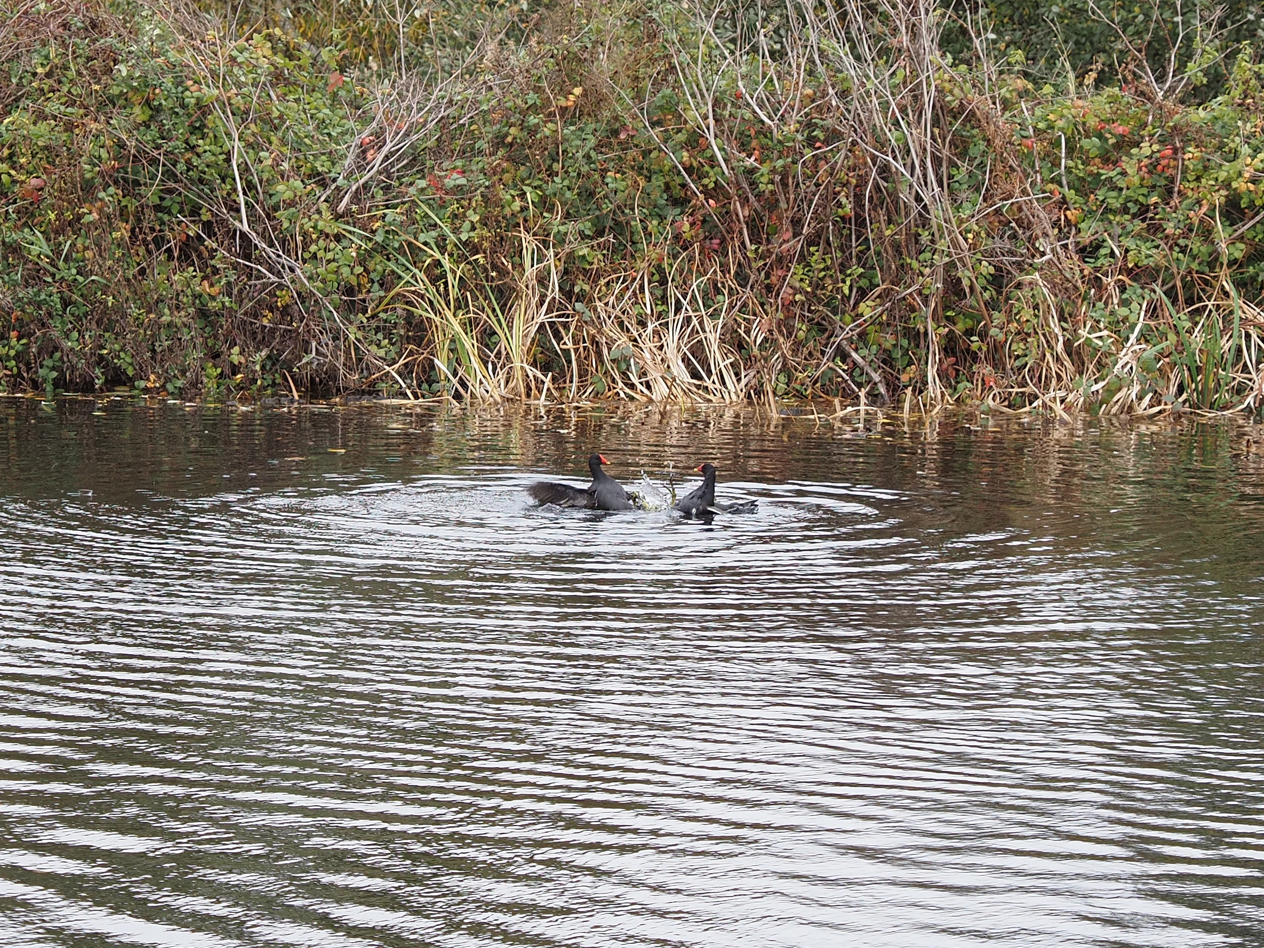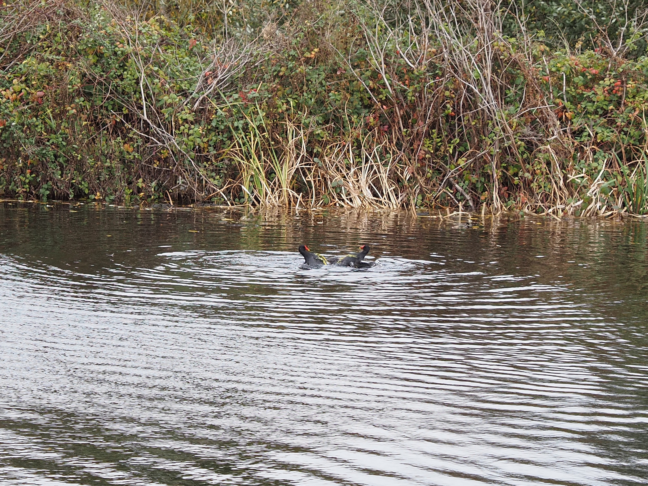 Not to be outdone by a couple of head waving swans, the moorhens chose to really show off with some synchronised swimming . . .